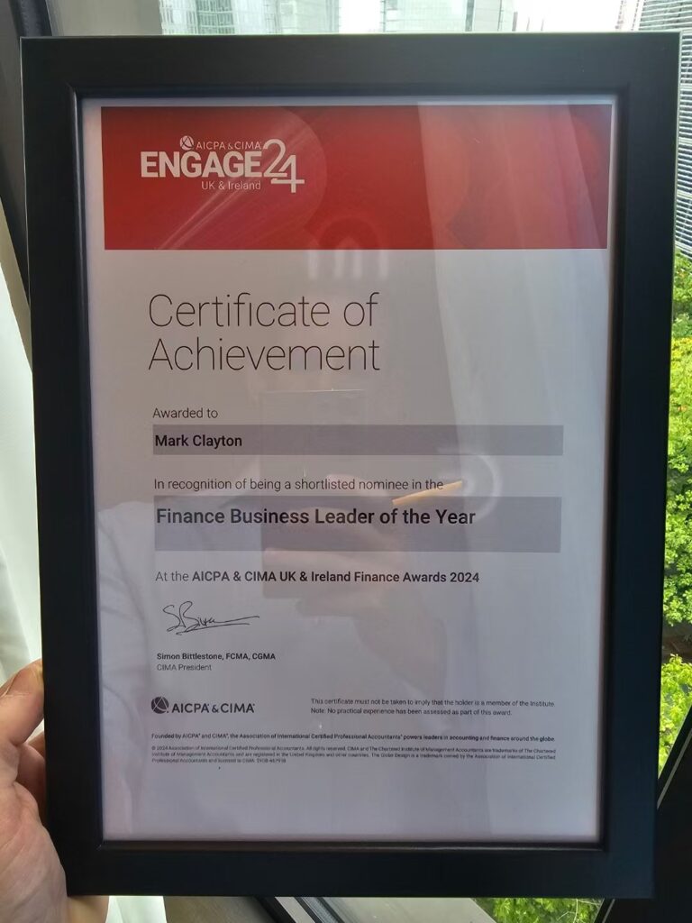 On 9th October 2024, I was named a finalist and runner-up for the Finance Business Leader of the Year award at the AICPA & CIMA ENGAGE UK & Ireland Finance Awards 2024, held at the Hilton Tower Bridge in London, as part of CIMA’s flagship two-day ENGAGE conference.